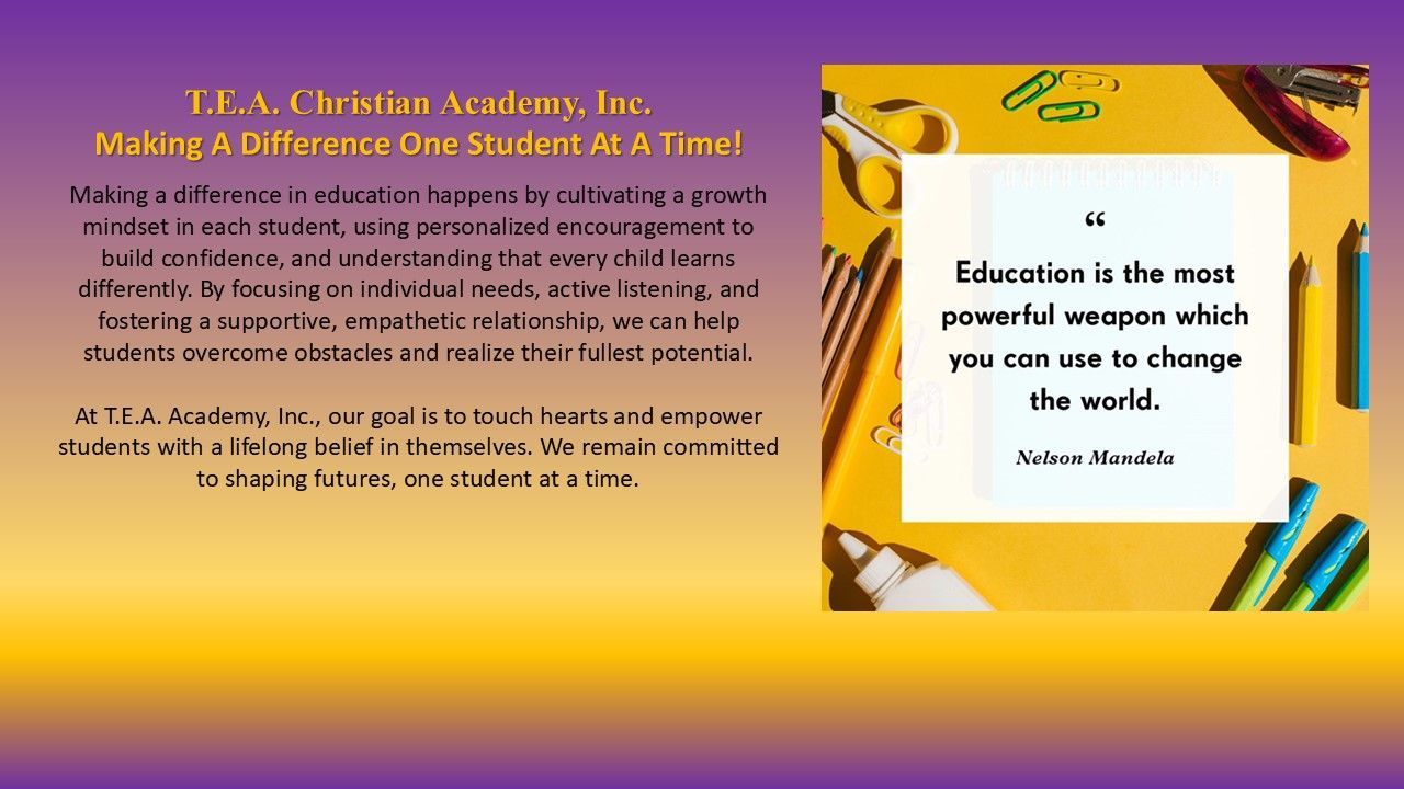 T.E.A. Christian Academy supports the achievement of high standards in academic performance, the development of inspired leaders, and the encouragement of innovative thinking. T.E.A. Christian Academy is committed to providing continuous improvement in research-based exemplary practice and data-informed decision-making for the staff and students. We are committed to nurture, challenge, and guide our students in a CHRISTIAN environment to thrive and excel.